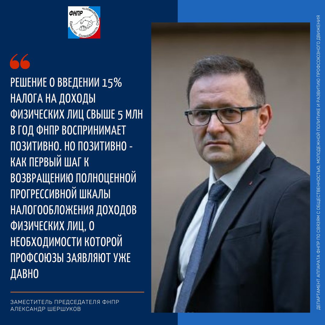 -— Решение о введении 15% налога на доходы физических лиц свыше 5 млн в год ФНПР воспринимает позитивно. Но позитивно - как первый шаг к возвращению полноценной прогрессивной шкалы налогообложения доходов физических лиц, о необходимости которой профсоюзы заявляют уже давно.