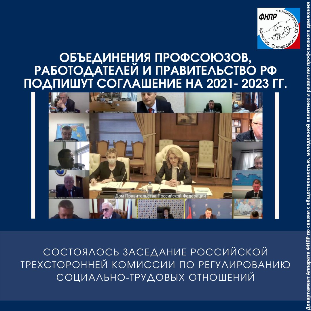 Во вторник, 29 декабря, состоялось очередное заседание Российской трехсторонней комиссии по регулированию социально-трудовых отношений, участие в которой приняла Заместитель Председателя ФНПР Нина Кузьмина. Одним из ключевых вопросов Комиссии стала подготовка к подписанию Генерального соглашения между общероссийскими объединениями профсоюзов, общероссийскими объединениями работодателей и Правительством Российской Федерации на 2021 - 2023 годы. Как отметила заместитель Председателя Правительства, координатор РТК Татьяна Голикова мероприятие, посвящённое подписанию Соглашению намечено на начало следующего года.
