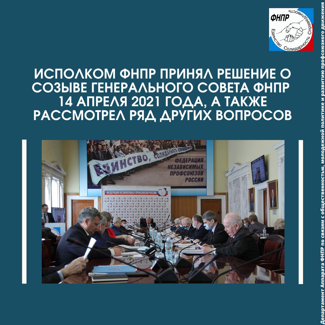 Исполком ФНПР принял решение о созыве Генерального Совета ФНПР 14 апреля 2021 года в городе Москве. В повестке планируется рассмотреть вопросы: о ситуации в стране и действиях профсоюзов, о ходе выполнения Плана практических действий по реализации решений Х съезда ФНПР и ряд других вопросов.