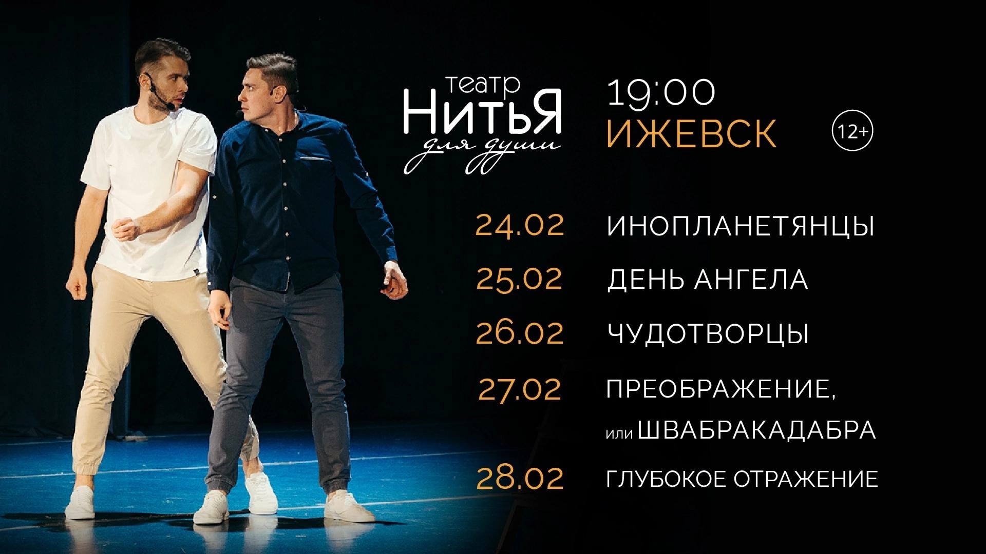 В Ижевск приезжает Театр для души «НитьЯ» со спектаклями цикла «Я — Счастье!»! Проведи пять незабываемых вечеров с потрясающими актерами Дамиром Садреевым и Алексеем Швецовым: